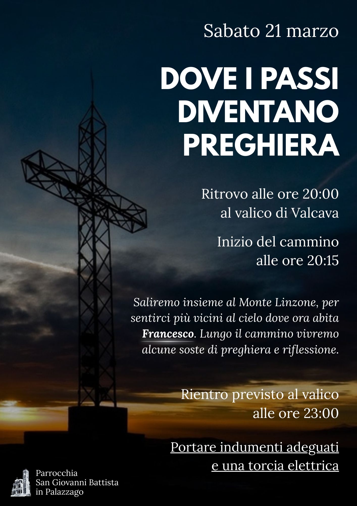Si salirà insieme sul Monte Linzone, per sentirci più vicini al cielo dove ora abita Francesco. Lungo il cammino vivremo alcune soste di preghiera e riflessione.